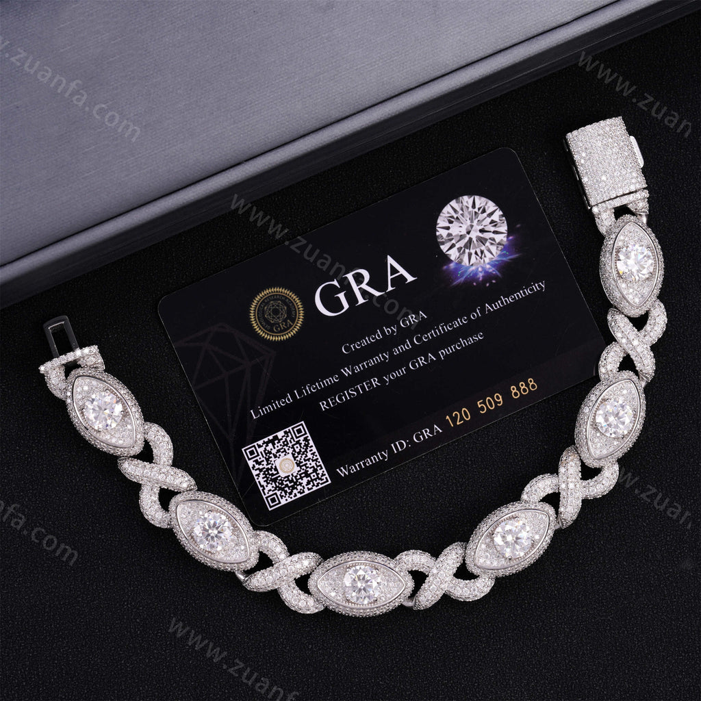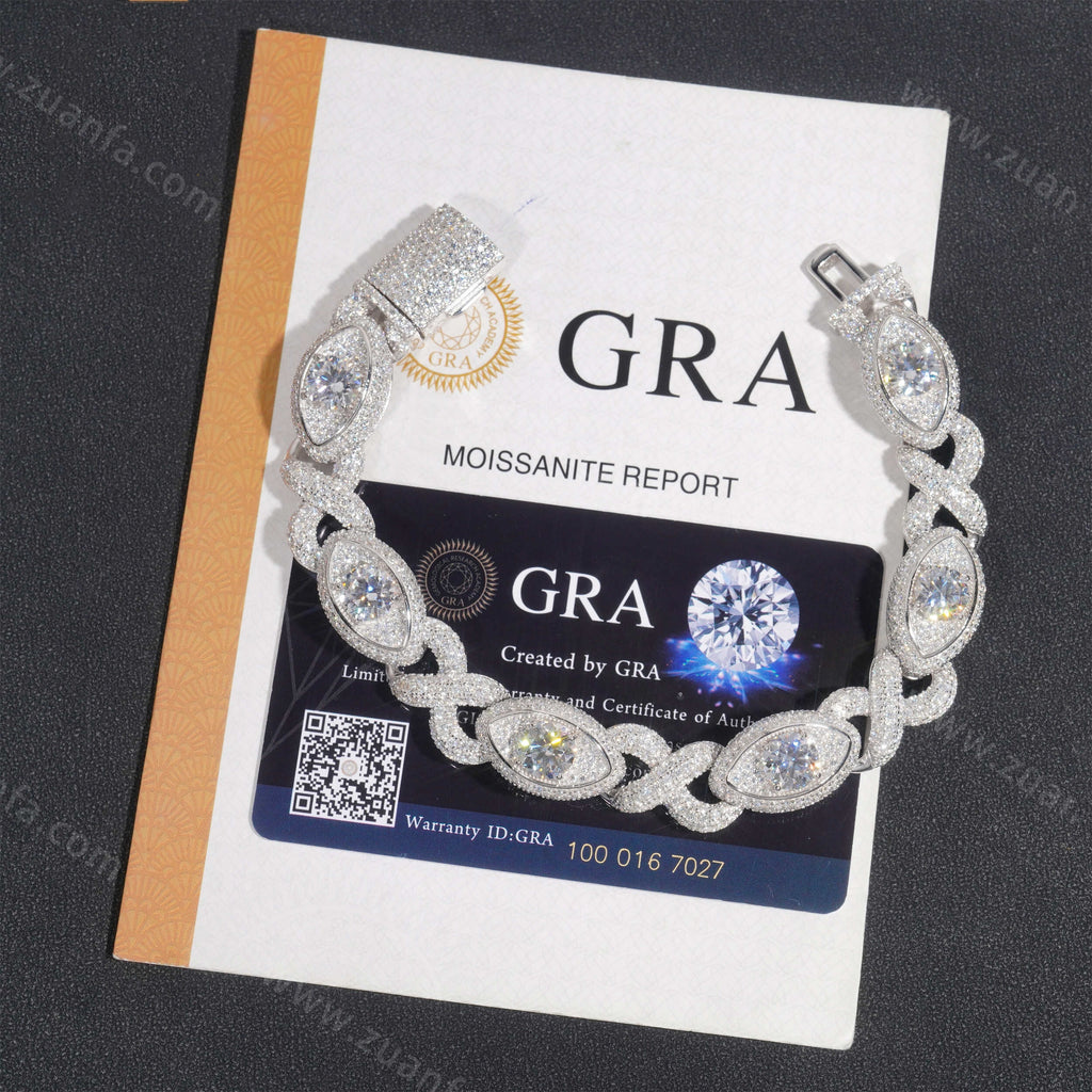It is iced out with round cut, D Color VVS moissanite flawless diamonds, placed in a prong diamond setting. All of the diamonds on this moissanite cuban link bracelet are guaranteed to pass the diamond tester.