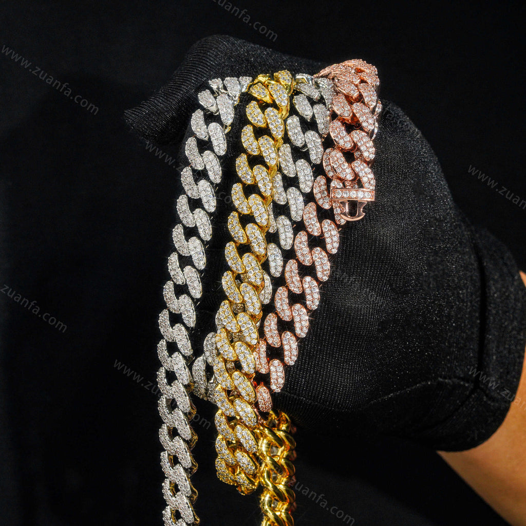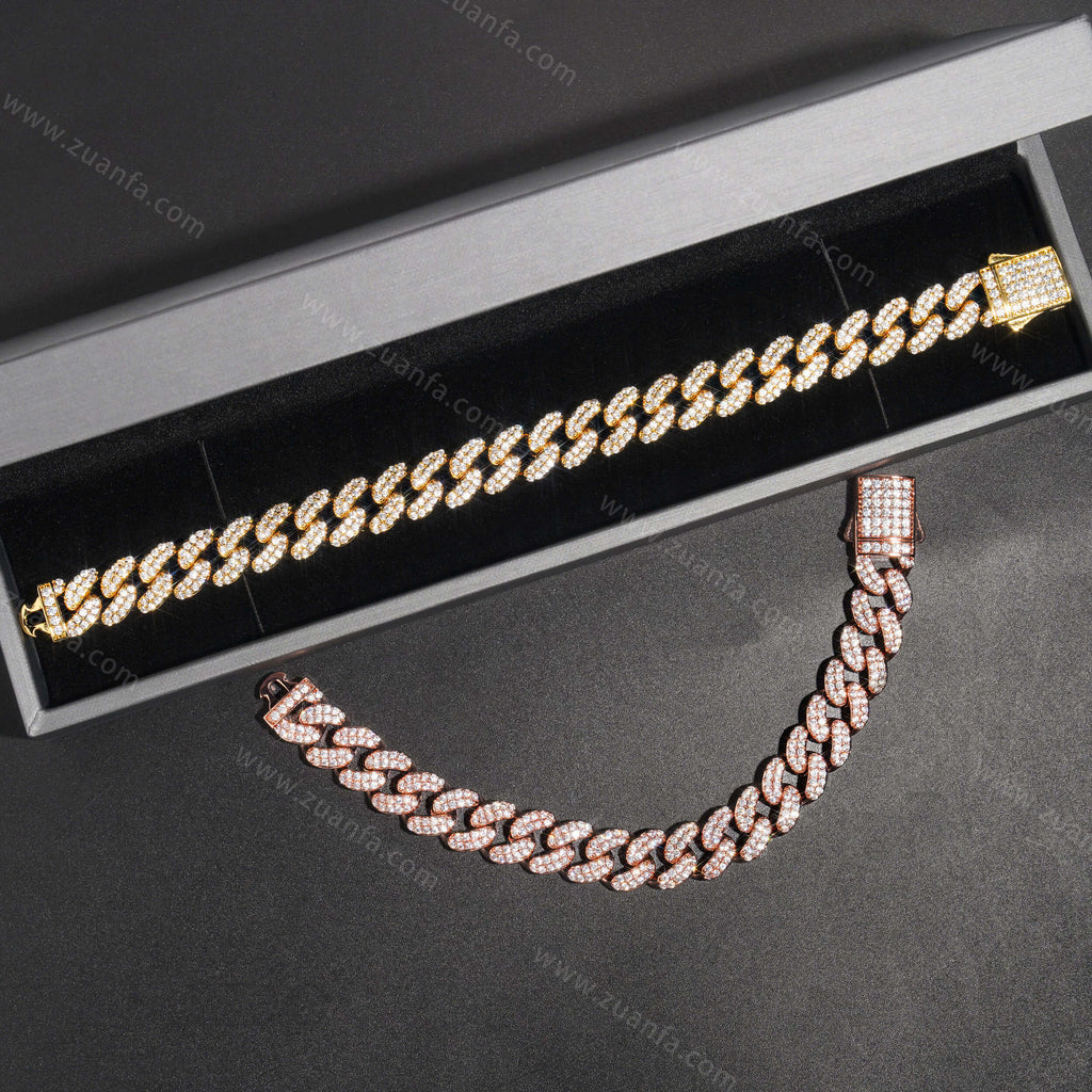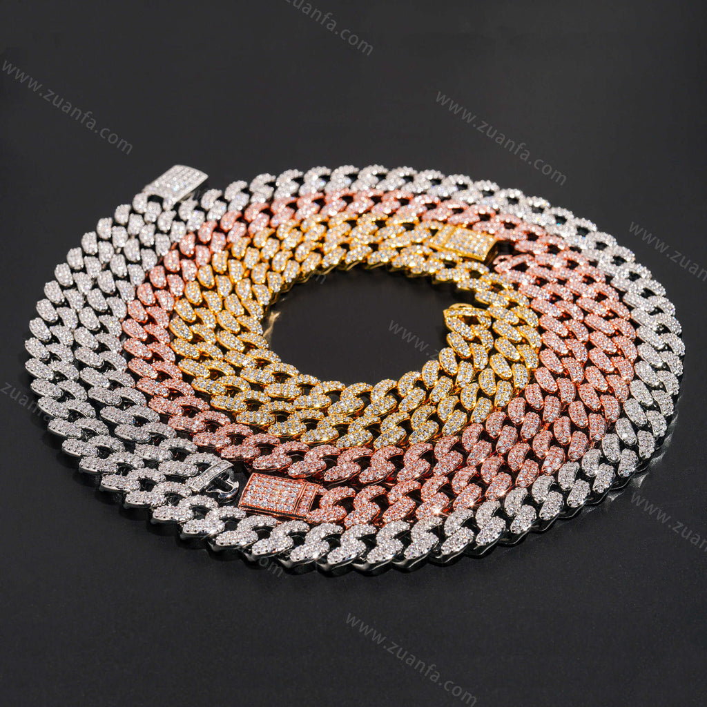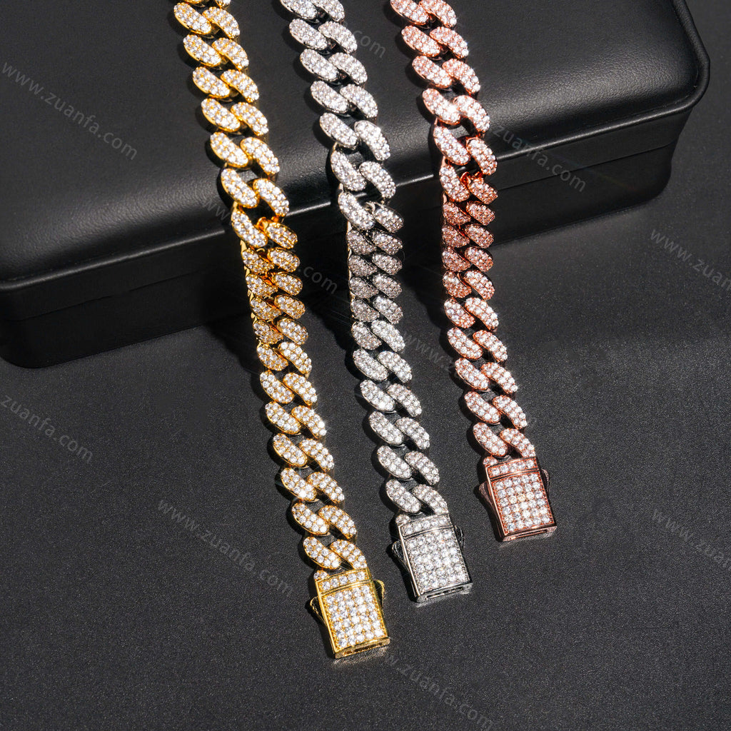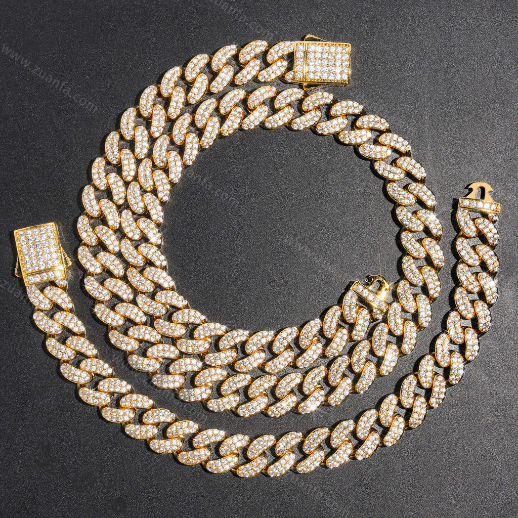 Zuanfa exclusive 12MM Iced Out Diamond Two Rows Cuban Link Chain is now available, made of Brass and plated with a thick layer of 18K Gold.
