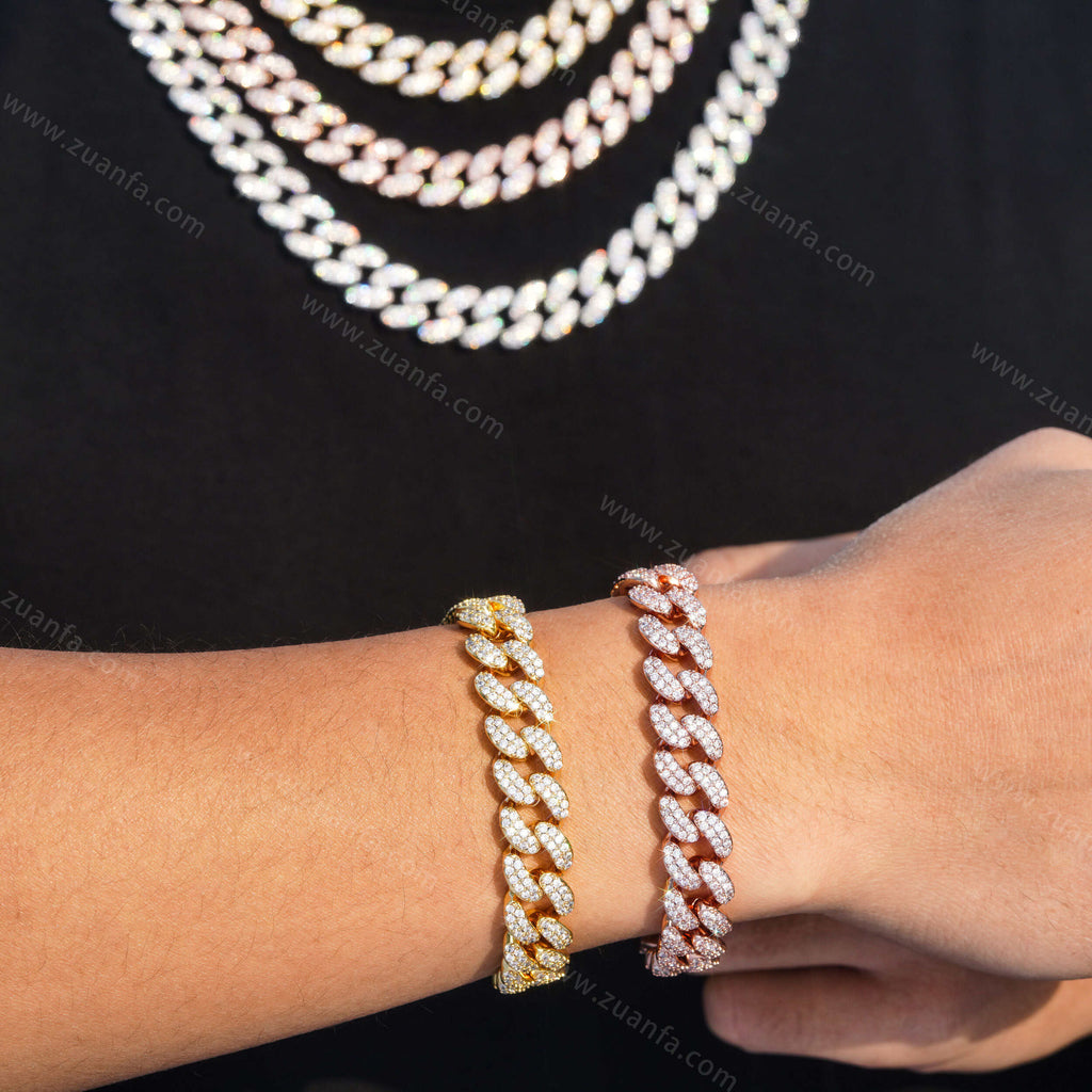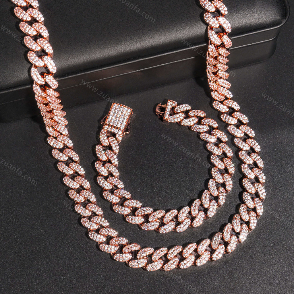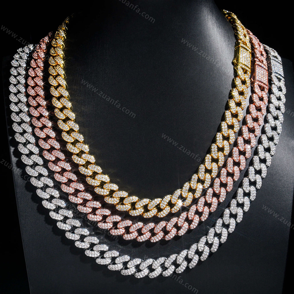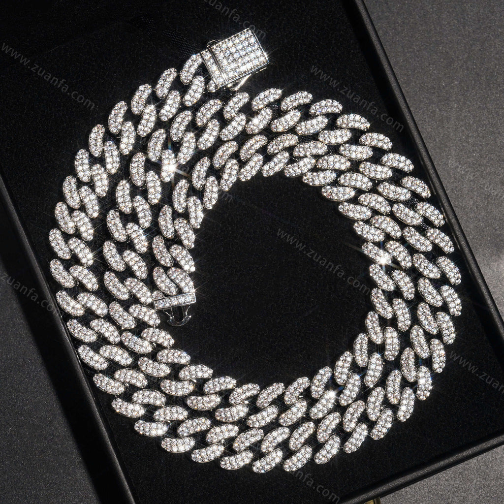 Zuanfa exclusive 12MM Iced Out Diamond Two Rows Cuban Link Chain is now available, made of Brass and plated with a thick layer of 18K Gold.