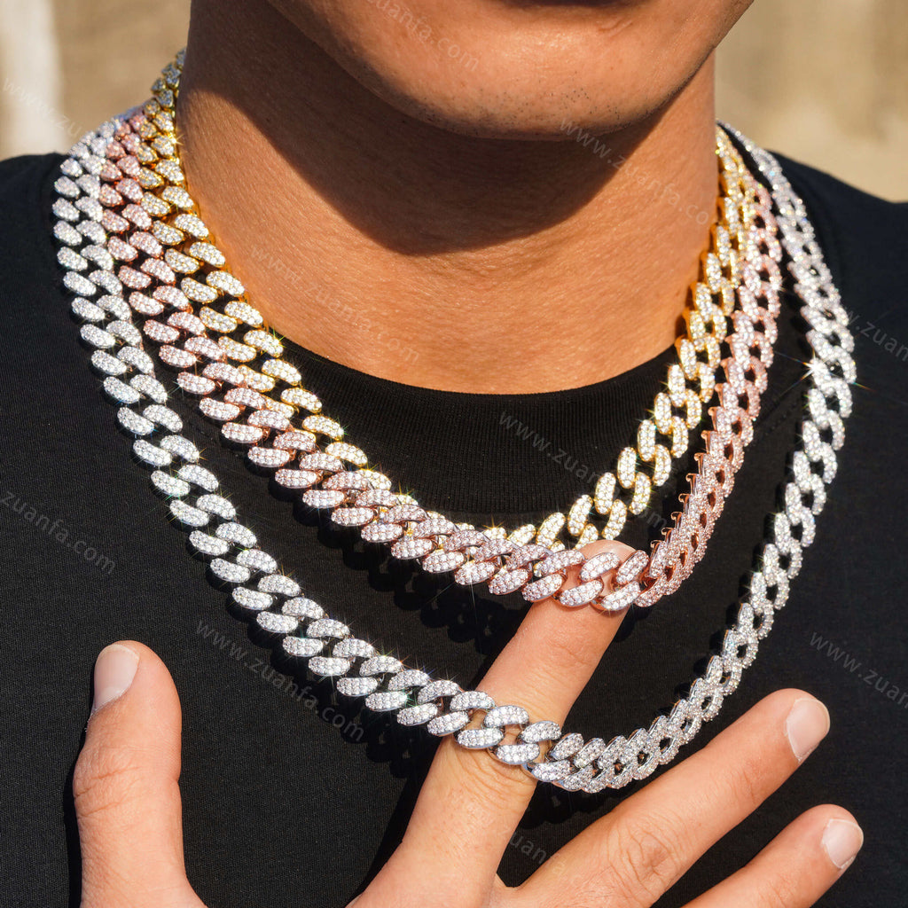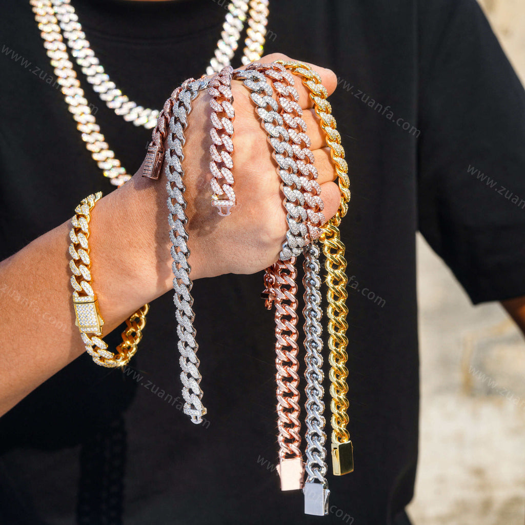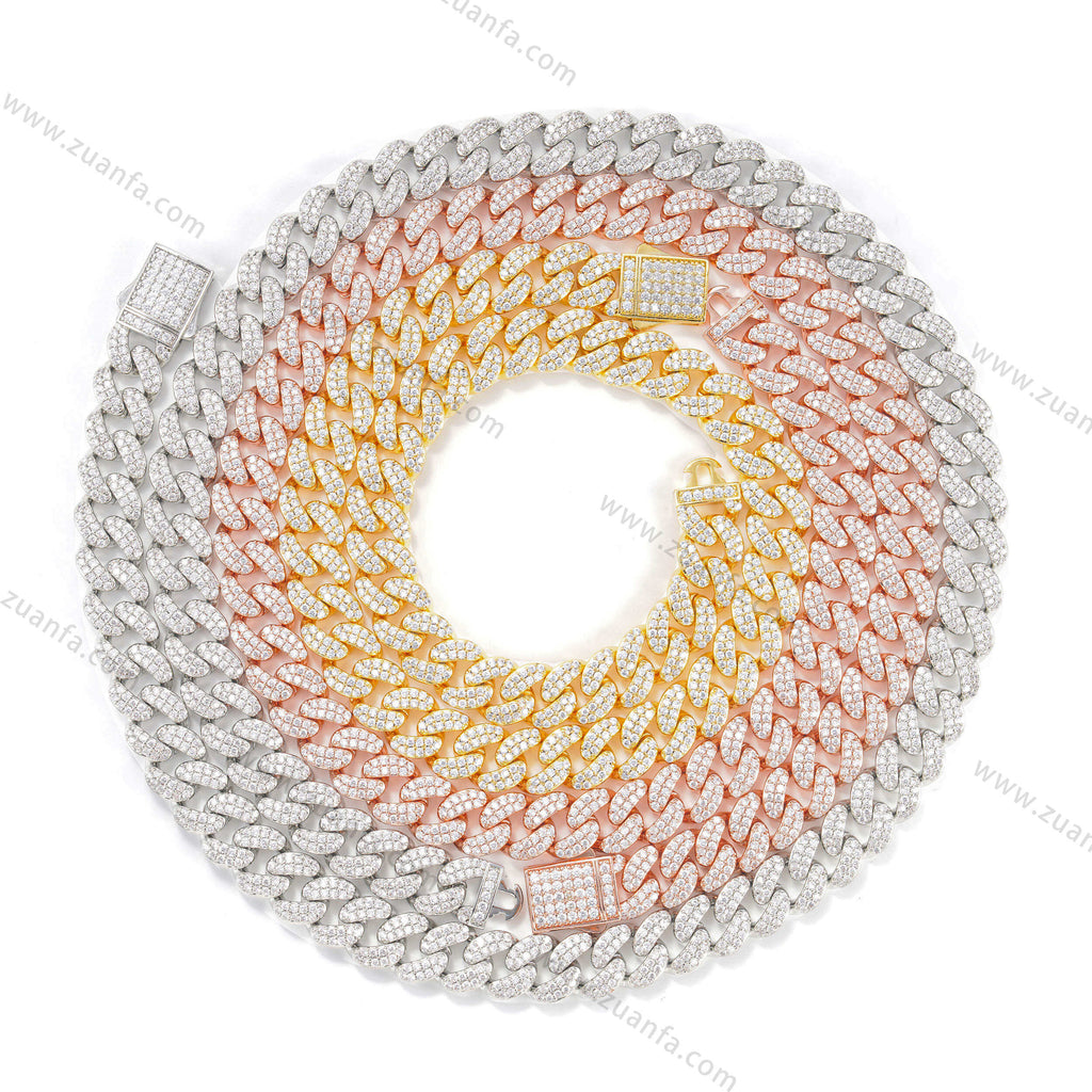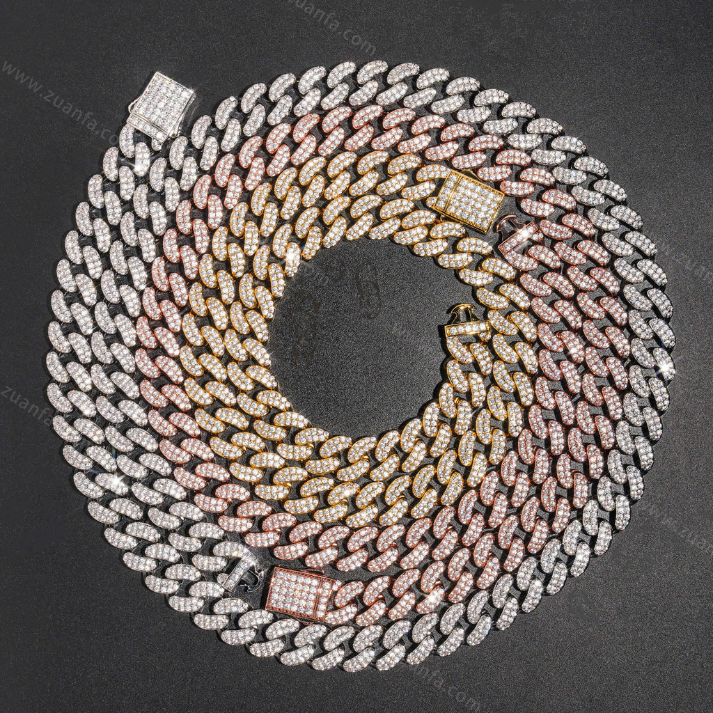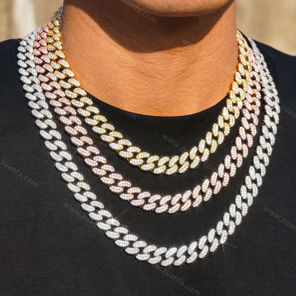 Zuanfa exclusive 12MM Iced Out Diamond Two Rows Cuban Link Chain is now available, made of Brass and plated with a thick layer of 18K Gold.