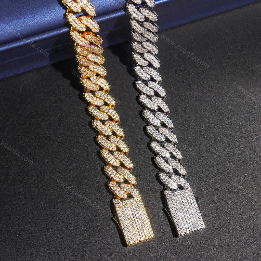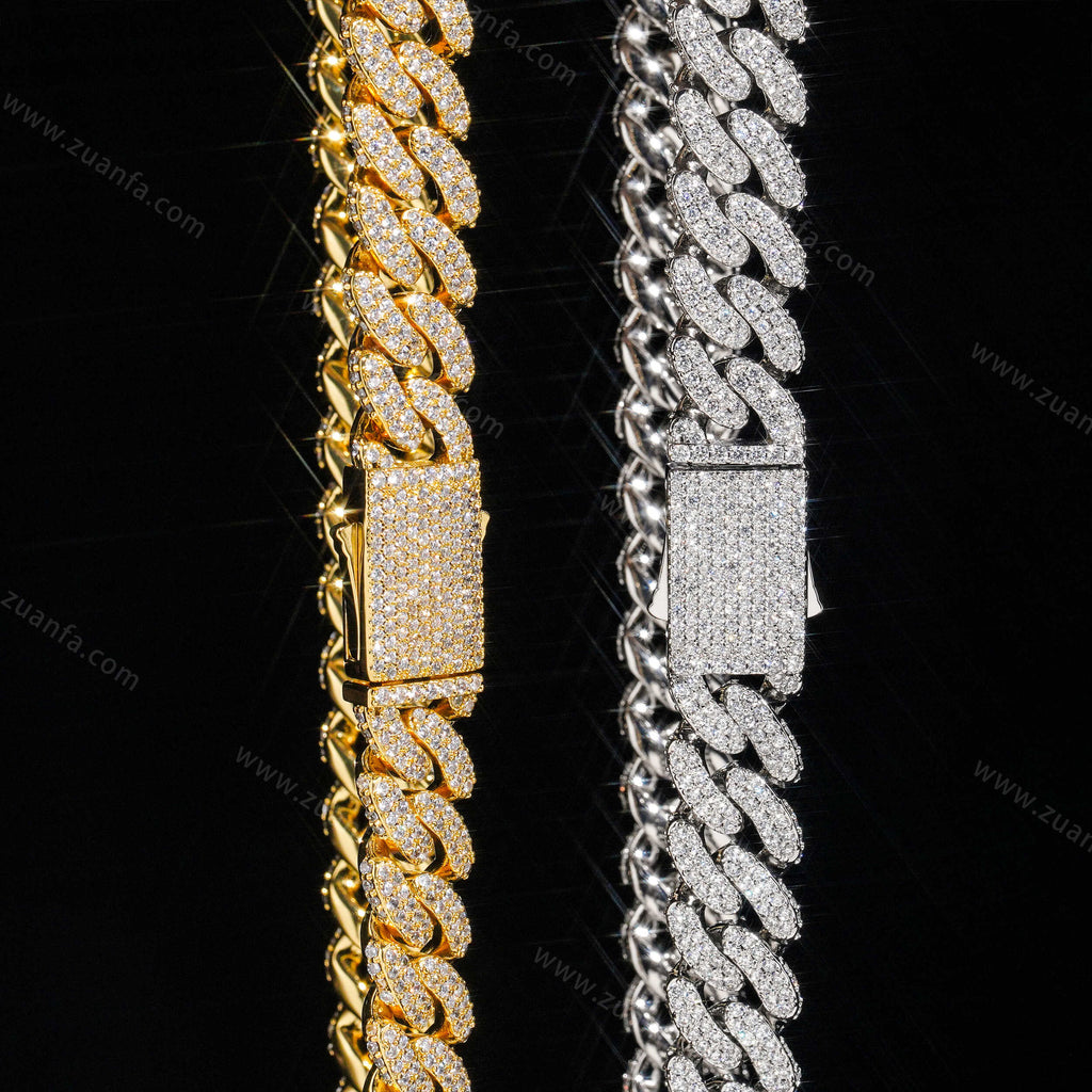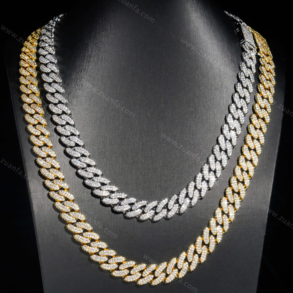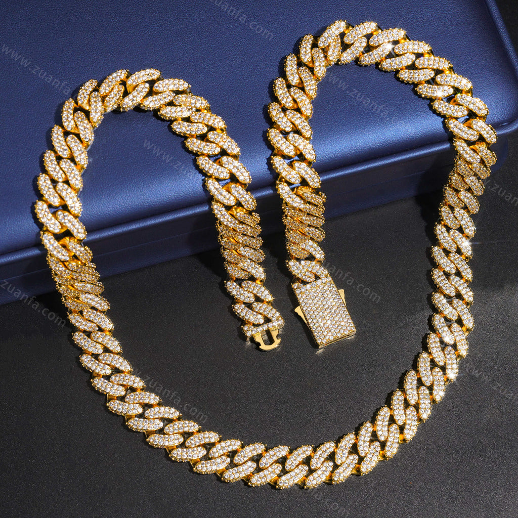 Zuanfa exclusive 13MM Iced Out Diamond Two Row Cuban Link Chain is now available, made of Brass and plated with a thick layer of 18K Gold.