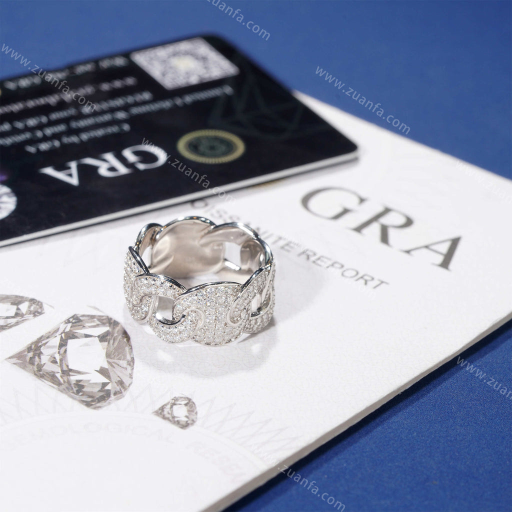 This moissanite ring is iced out with Round cut, colorless (D-Color), VVS moissanite flawless diamonds. All of the diamonds on this moissanite ring are guaranteed to pass the diamond tester.