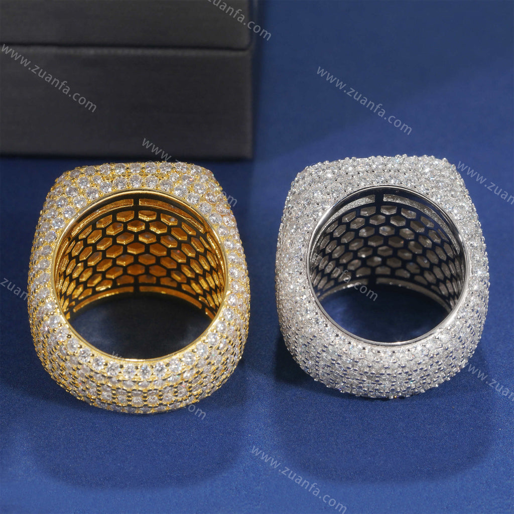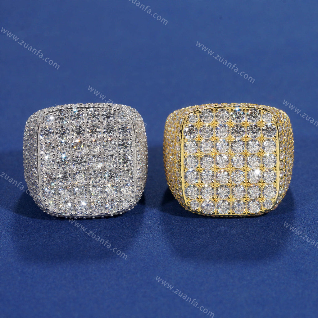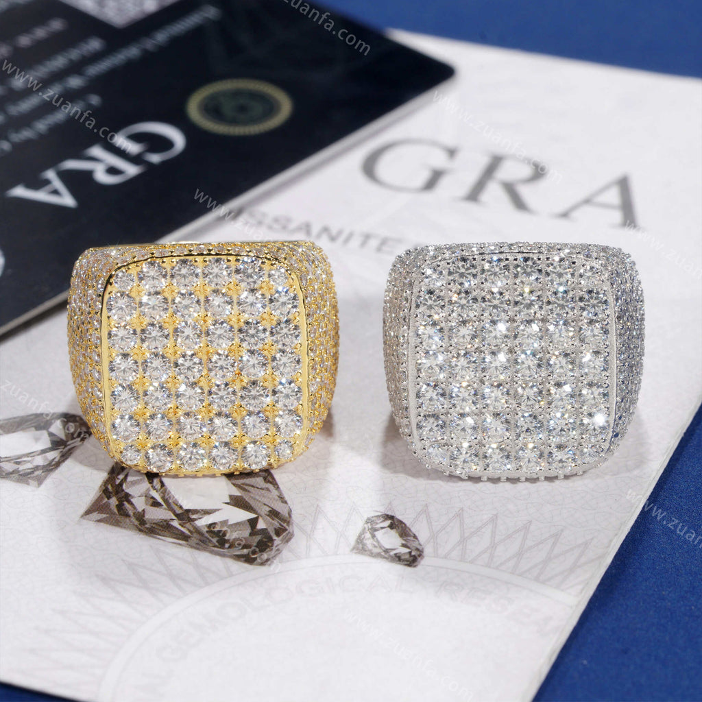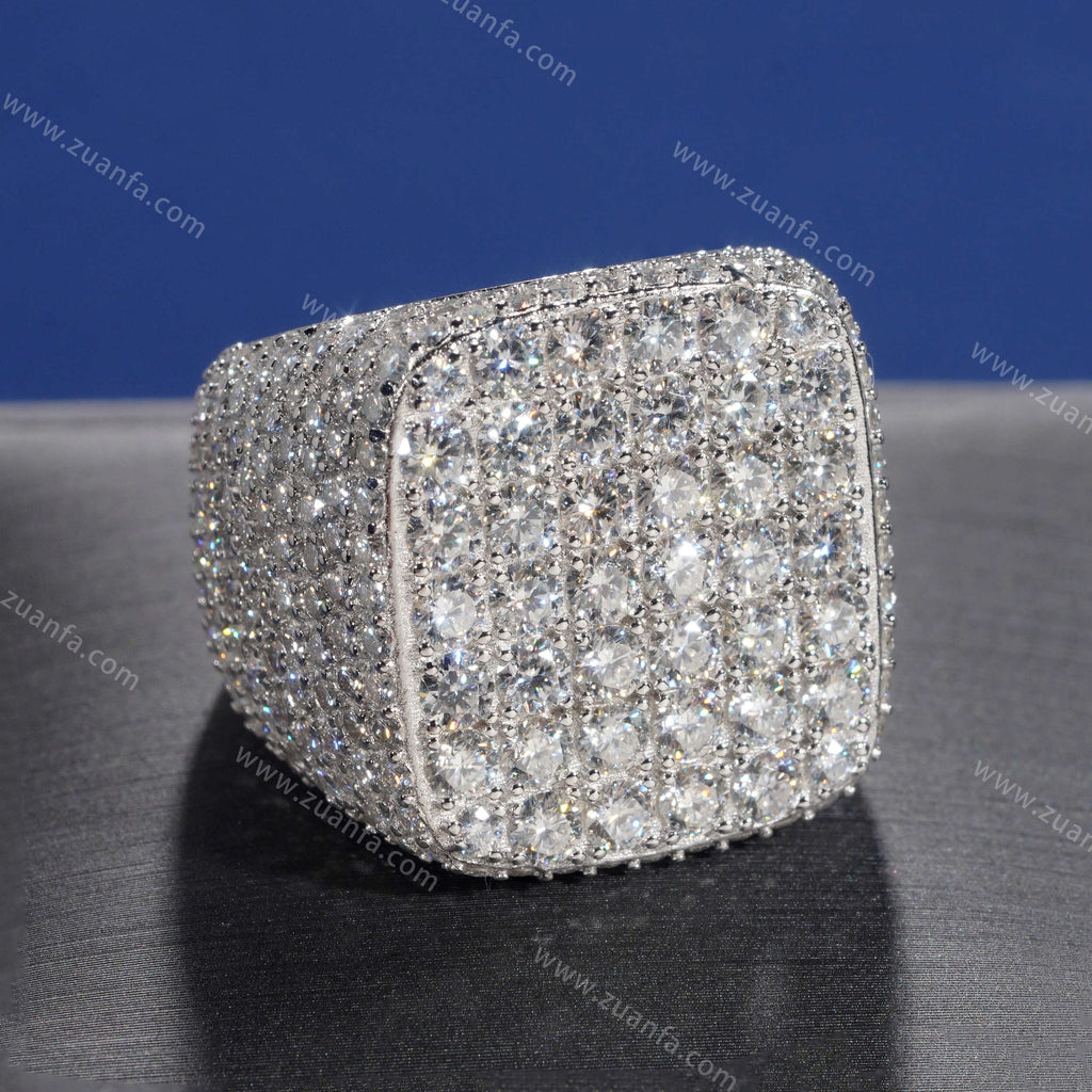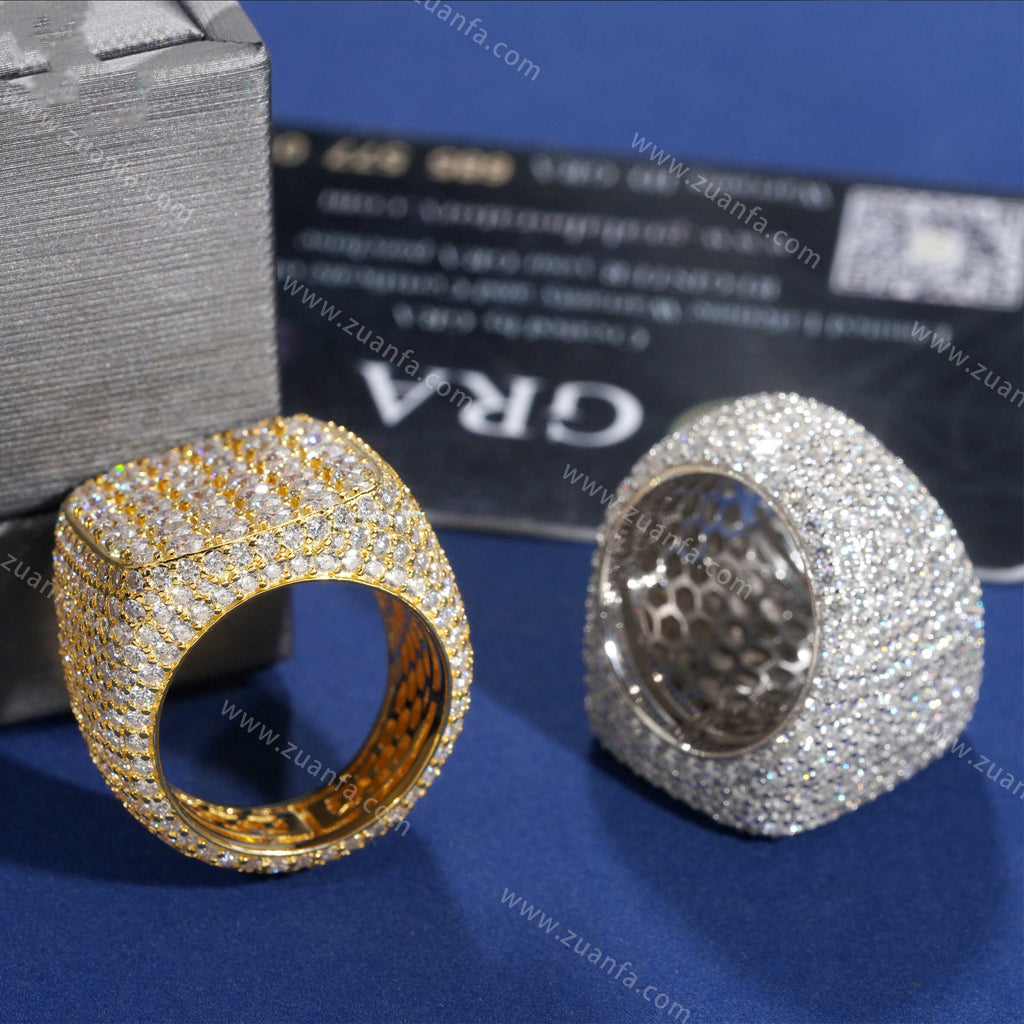 This moissanite ring is iced out with Round cut, colorless (D-Color), VVS moissanite flawless diamonds. All of the diamonds on this moissanite ring are guaranteed to pass the diamond tester.