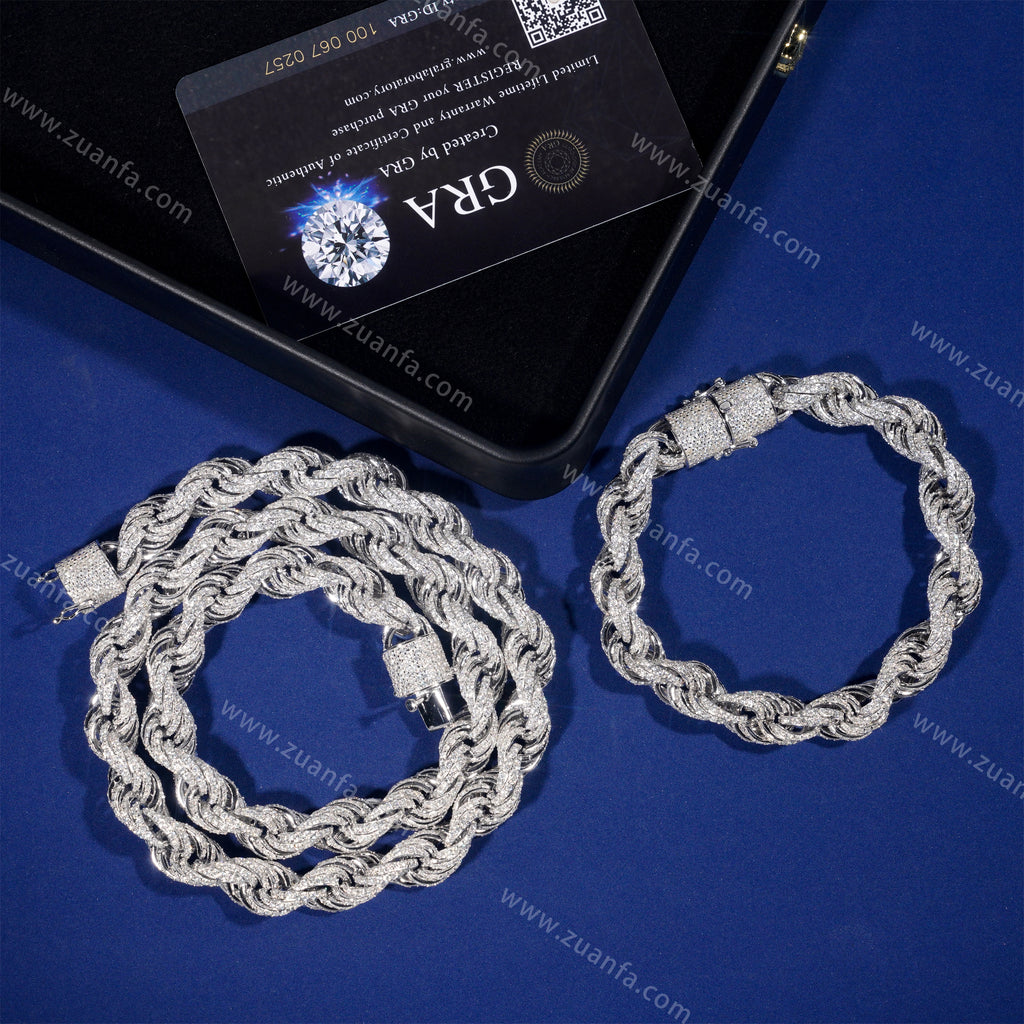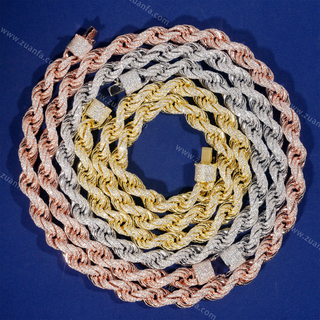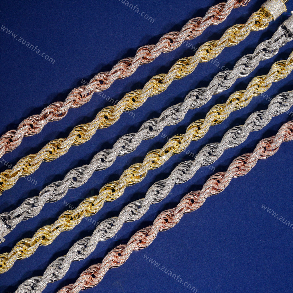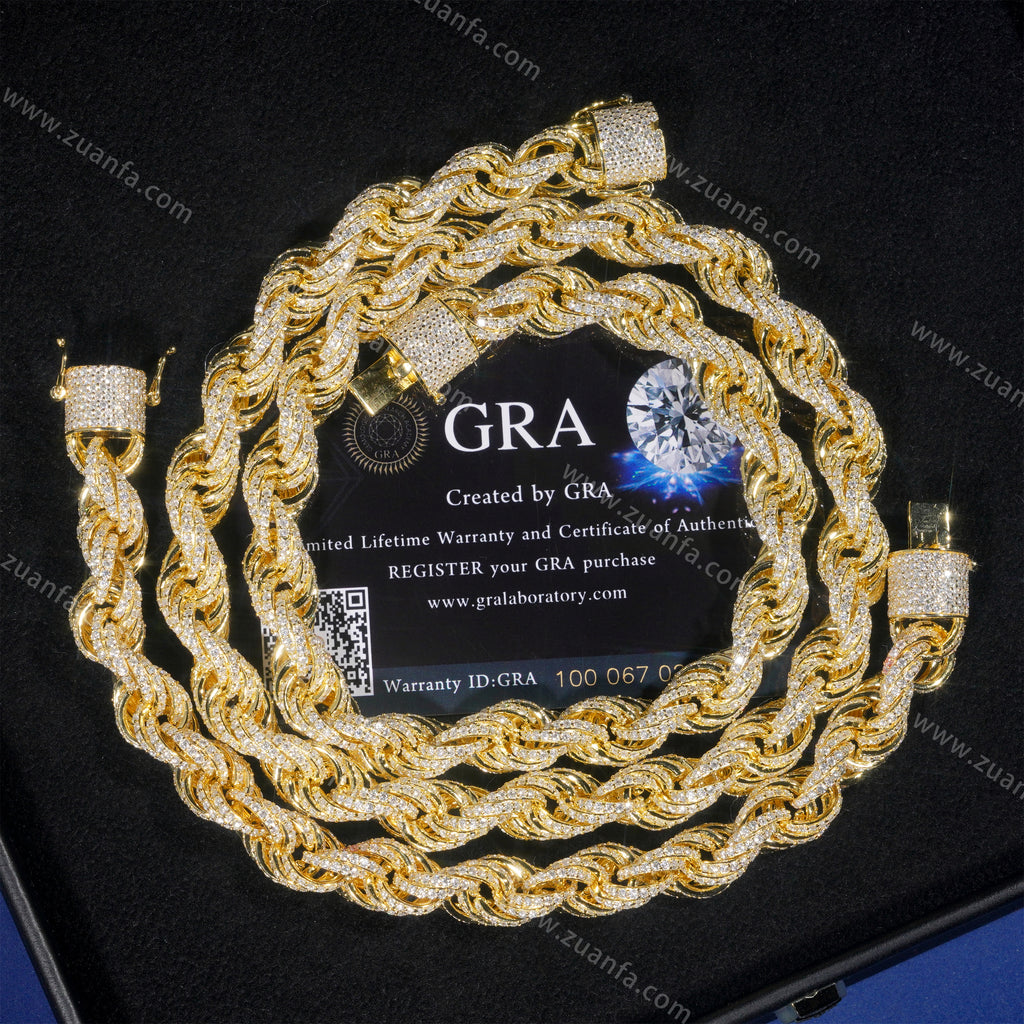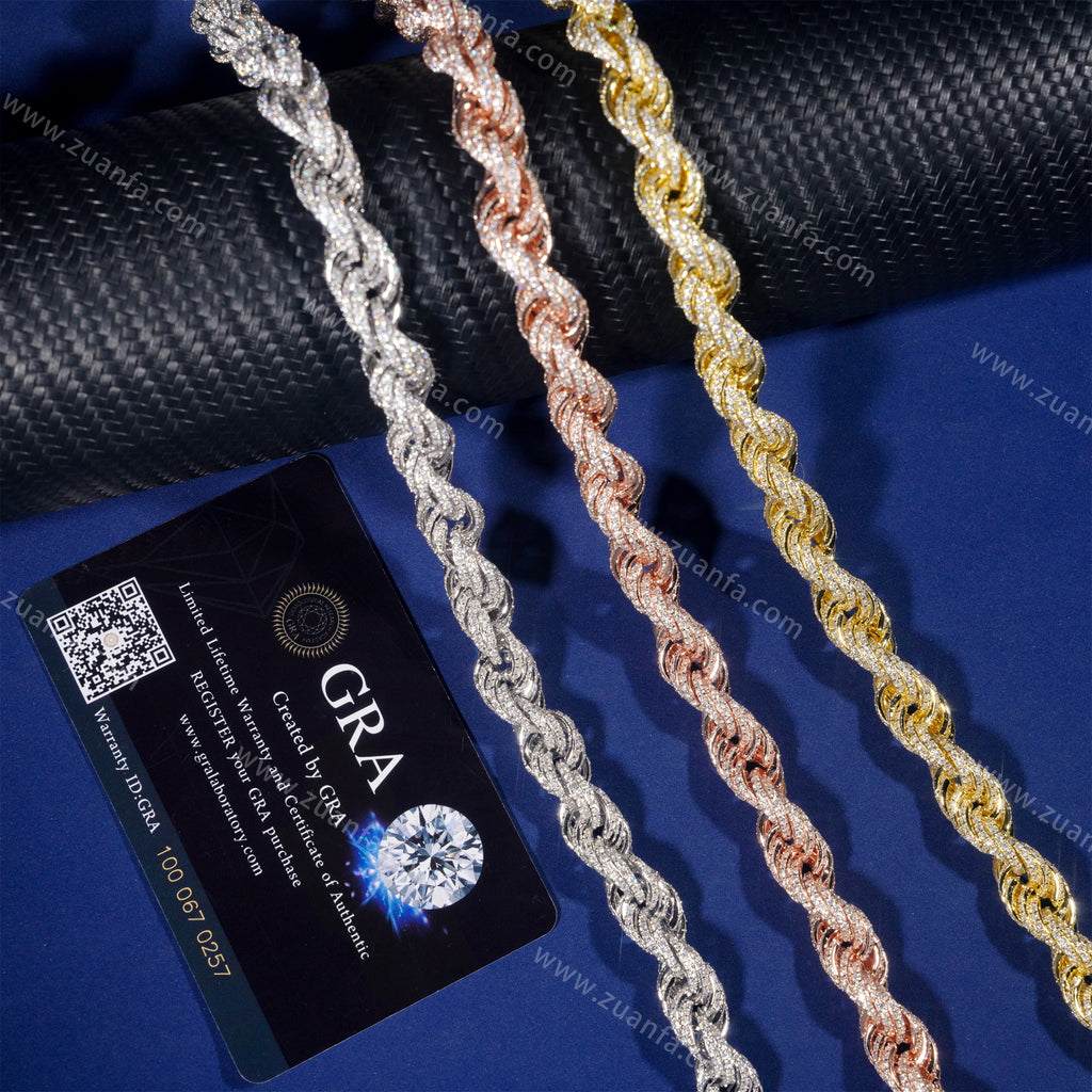 This Zuanfa exclusive 10MM Moissanite Rope Chain is made from 925 sterling silver and plated with a thick layer of 18K Gold.
