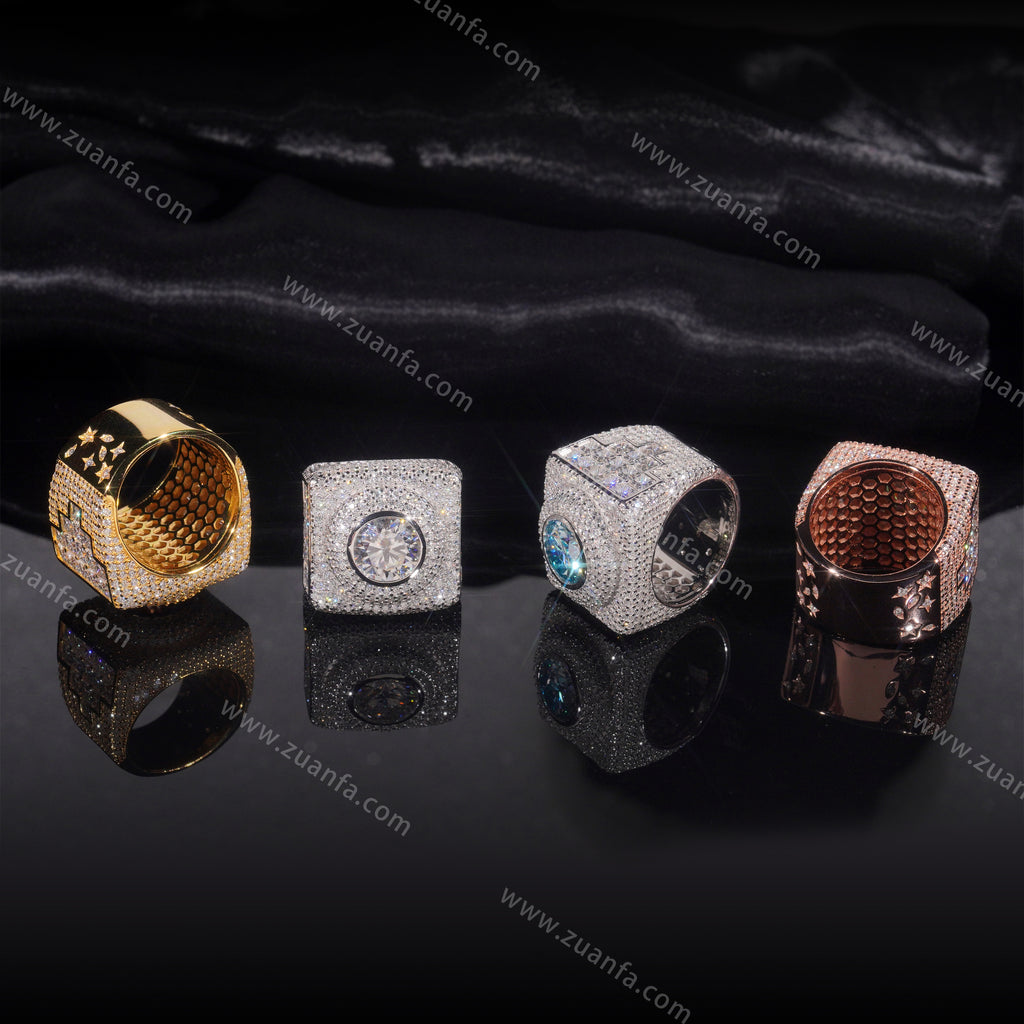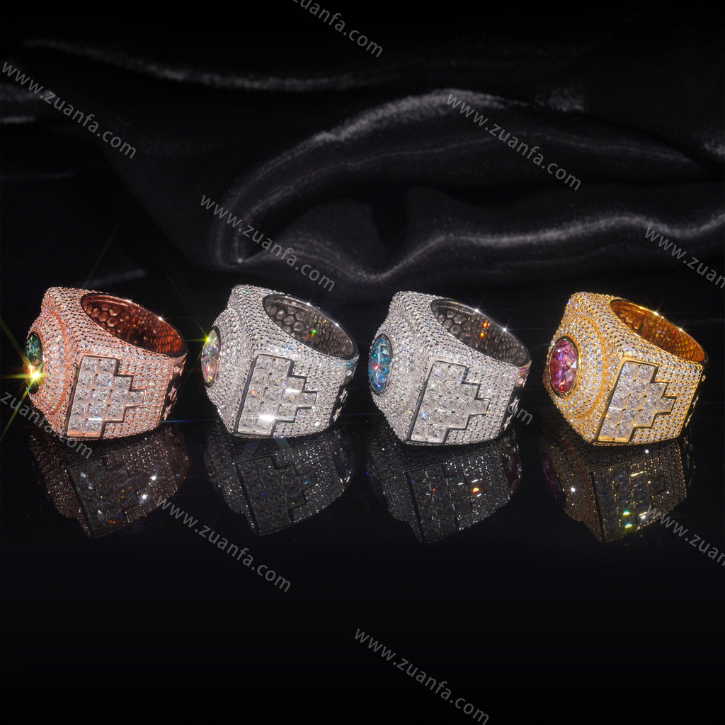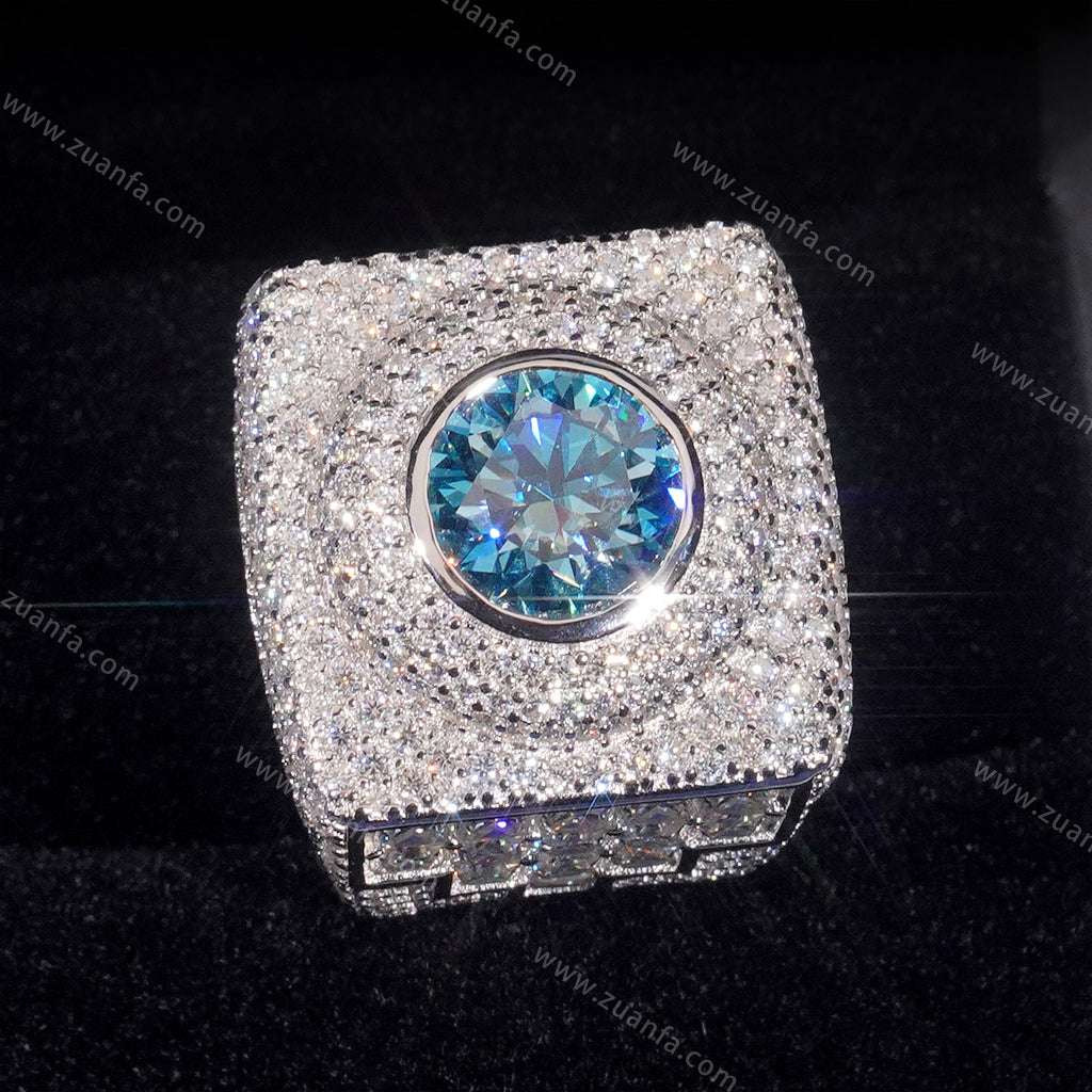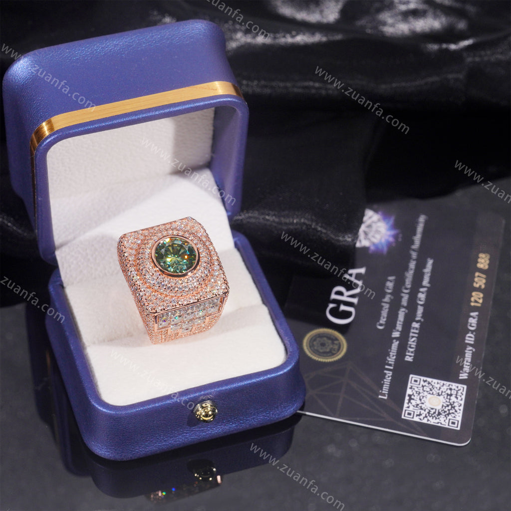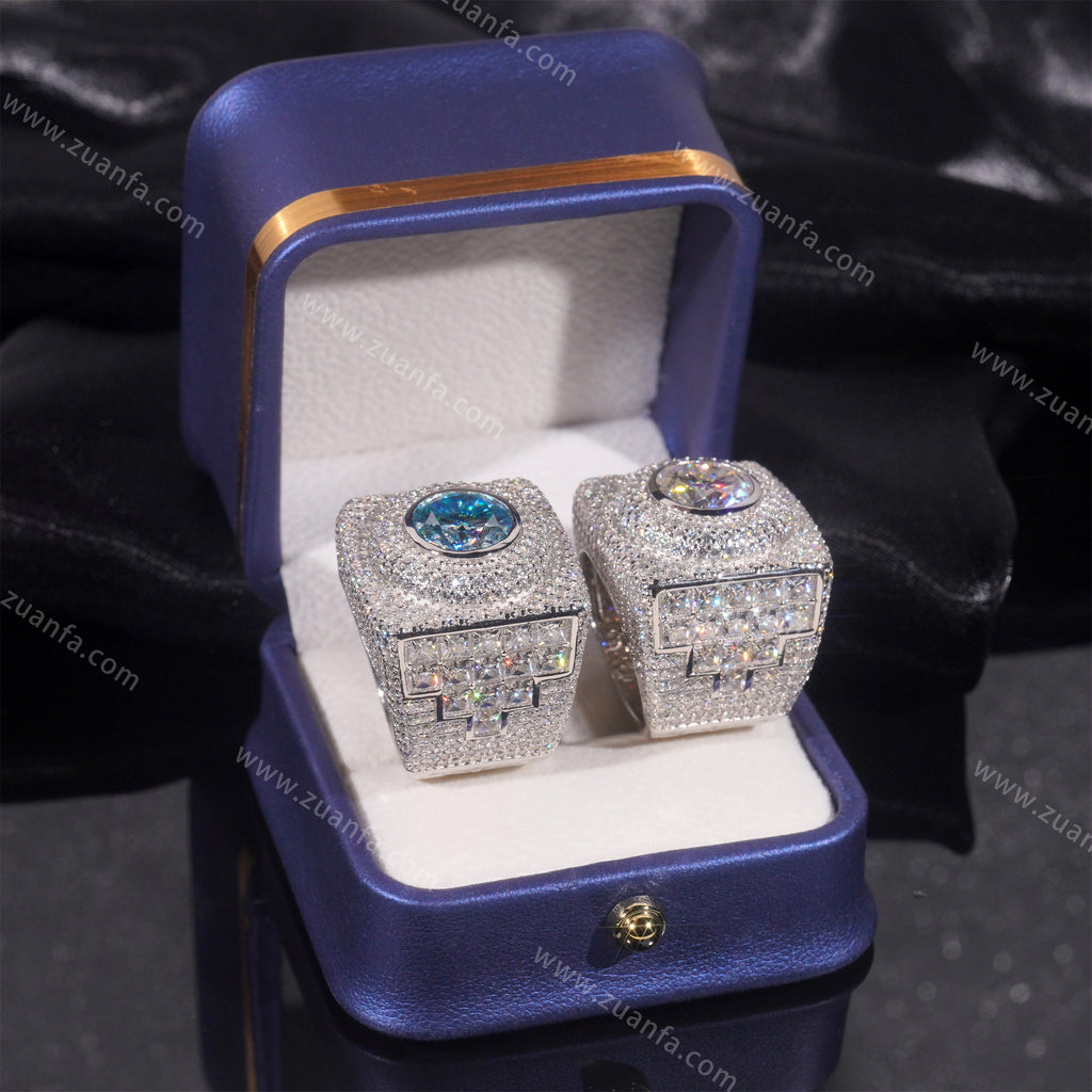 This moissanite ring is iced out with Round cut, colorless (D-Color), VVS moissanite flawless diamonds. All of the diamonds on this moissanite ring are guaranteed to pass the diamond tester.