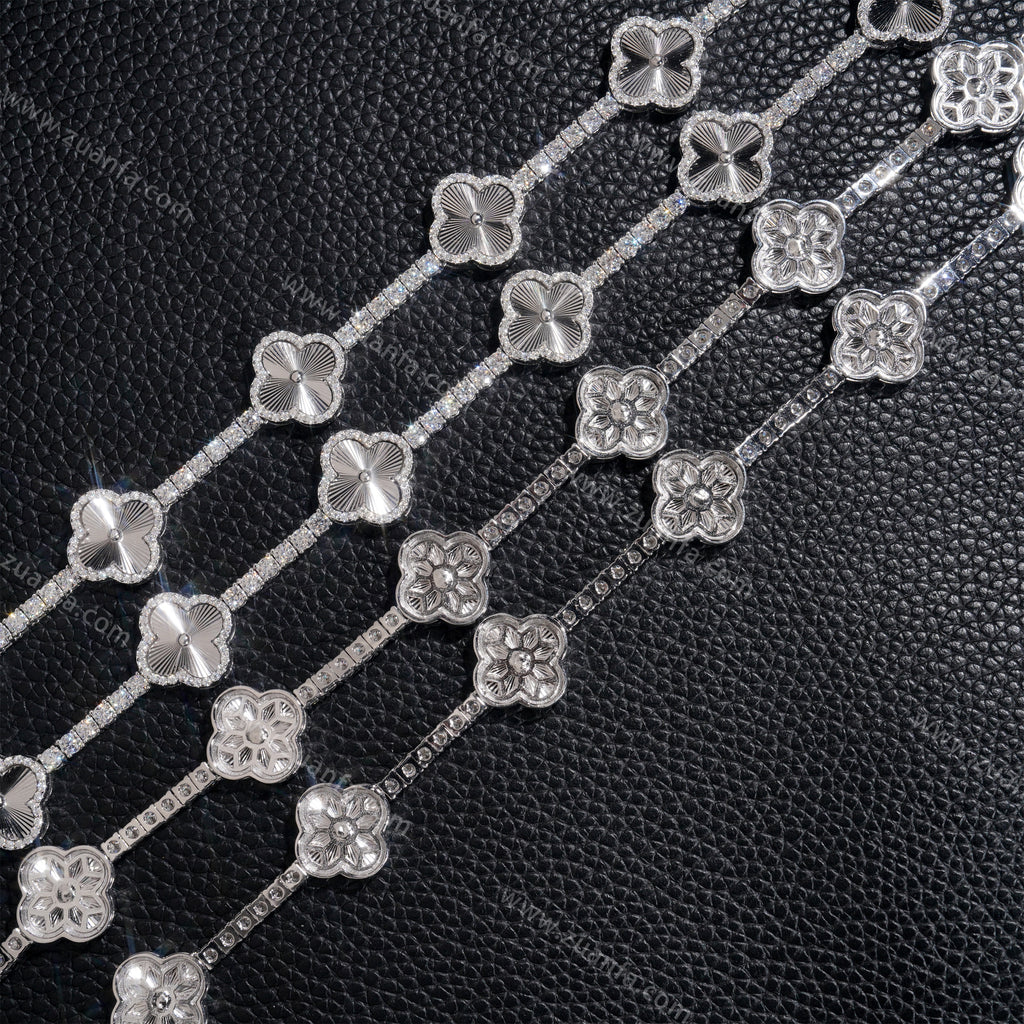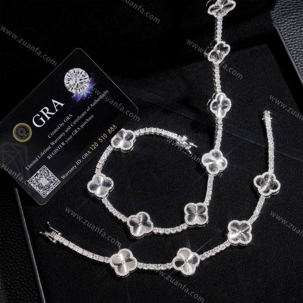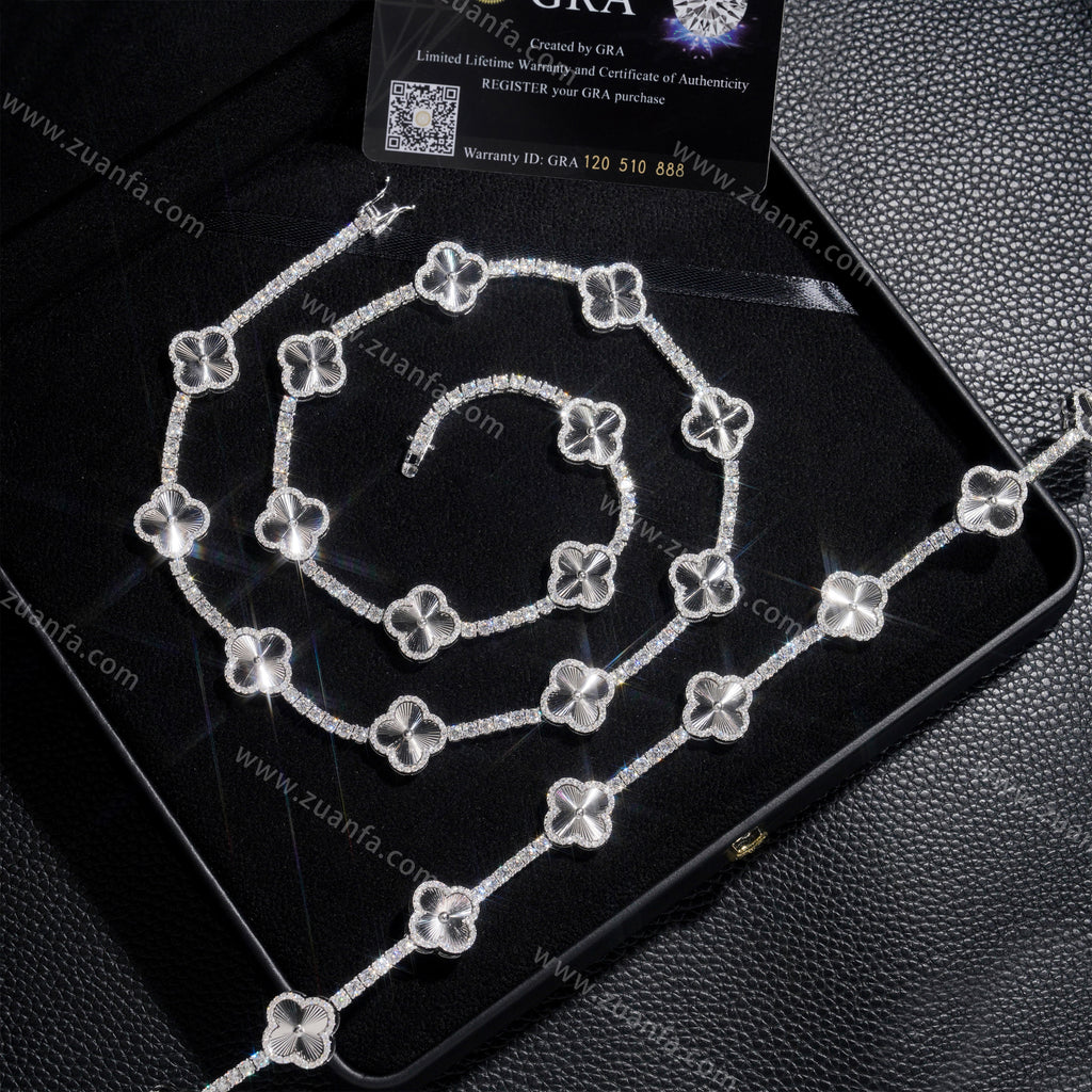 This Zuanfa exclusive Moissanite Clover Tennis Chain is made from 925 sterling silver and plated with a thick layer of 18K Gold.