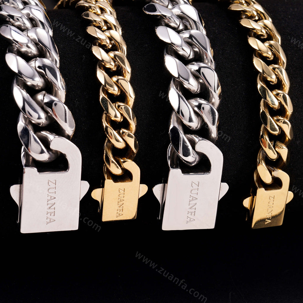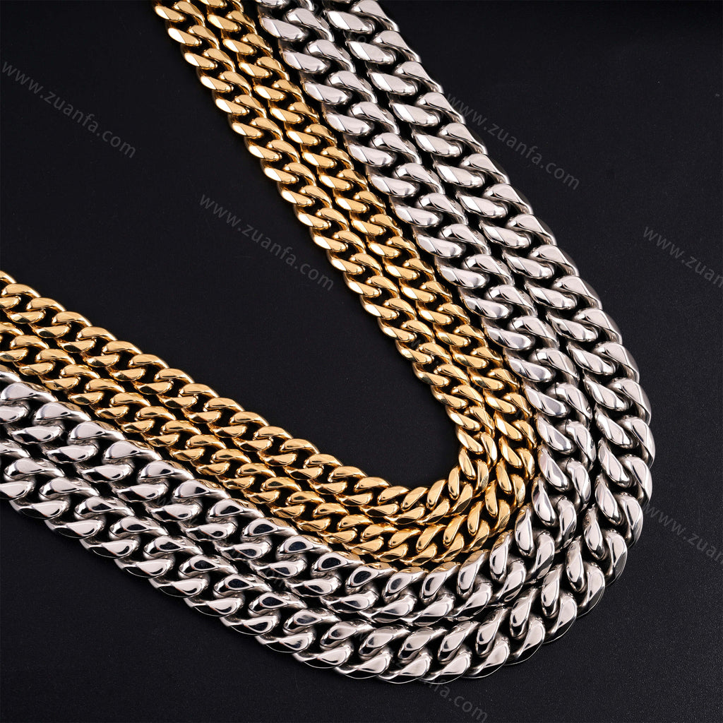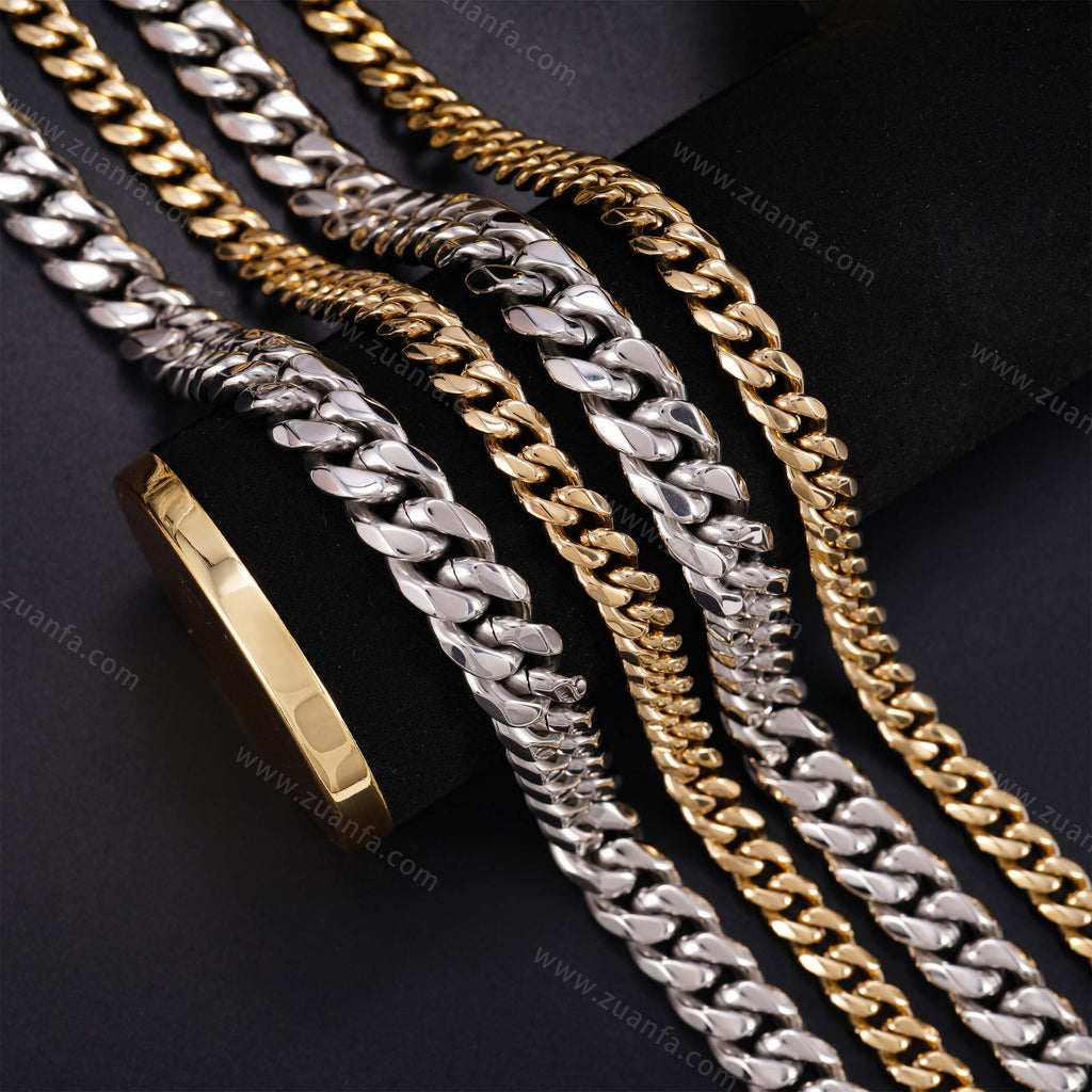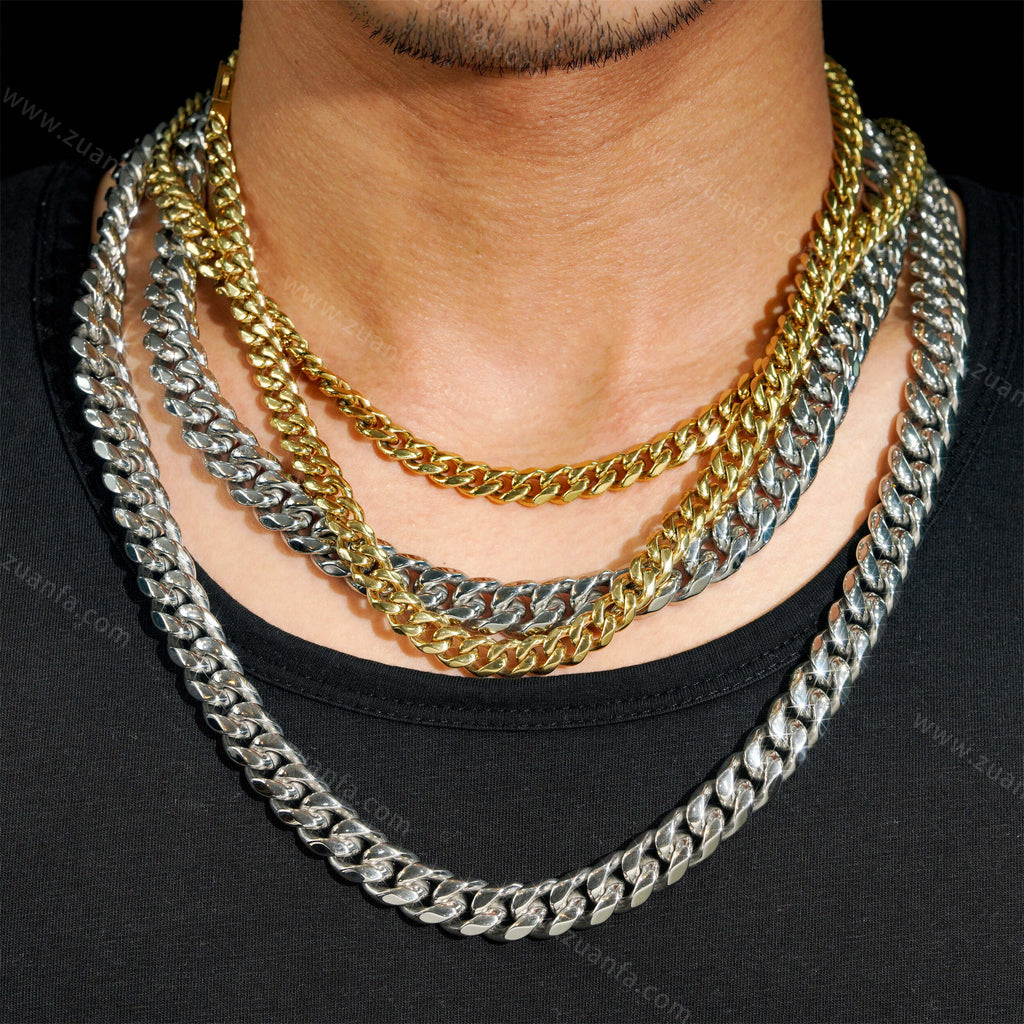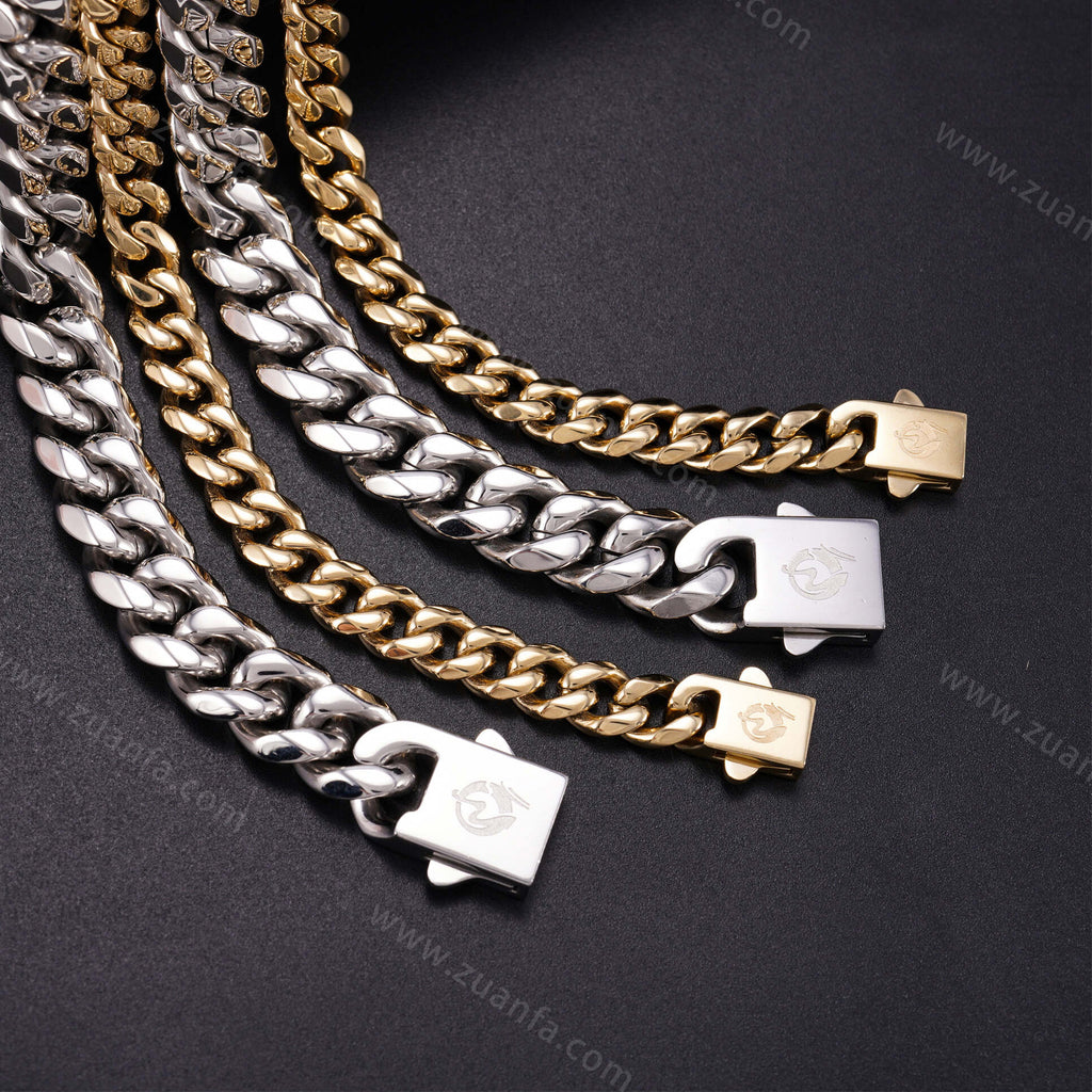 Zuanfa exclusive 12mm Cuban Link Chain is now available, made of 316L Stainless Steel and plated with a thick layer of 14K Gold.